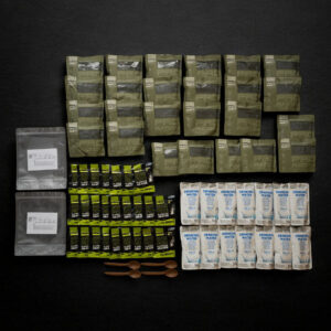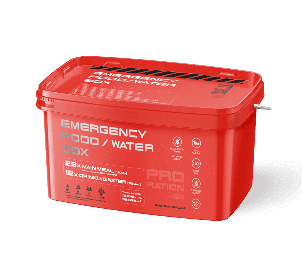 Dodatki: Woda pitna 330 ml 12 sztuk, podgrzewacze bezpłomieniowe 23 sztuki, łyżeczka 4 sztuki, 2x Zipper-bag