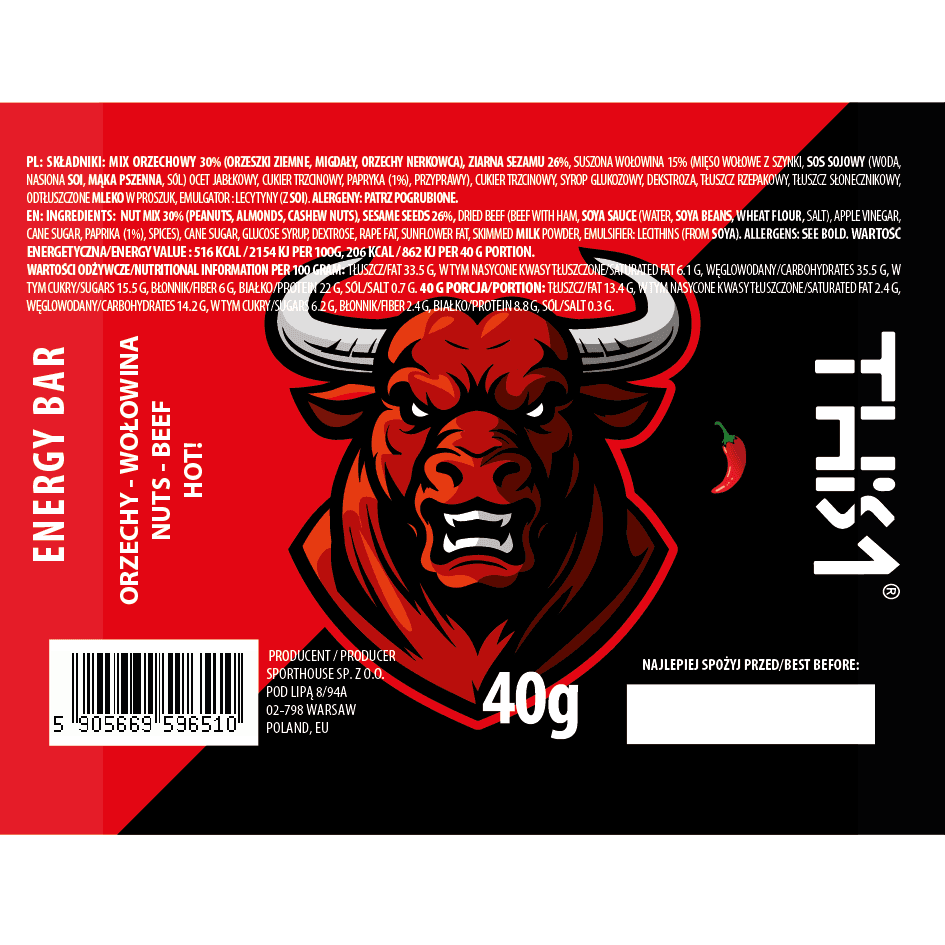 THIS 1 bar with beef HOT! is an energy bar created on the basis of nuts and seeds with the addition of spicy beef. It is perfectly balanced to provide a powerful long-lasting energy boost. The high amount of energy is provided by an optimal ratio of sugars (fast energy) and fat (“long” energy), where fats provide 2x the energy per gram.