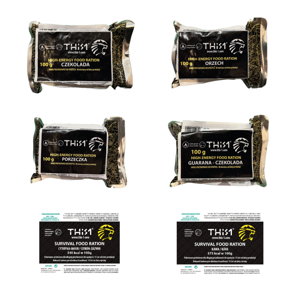 The peanut-flavored survival bar is made from a specially selected blend of peanuts, almonds and sunflower seeds , milled to a flour form and thoroughly mixed with other ingredients such as chocolate and sunflower seeds. Thanks to a special binder, heat treatment and vacuum packing in special airtight packaging, the bars remain fresh and edible for many years. Thanks to the nuts finely ground into meal form, the bar is not hard and is very tasty.