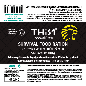 Baton survivalowy o smaku cytryny-imbiru ma lekko kwaskowo-ostry pobudzający smak i dostarcza olbrzymią porcję energii z mąki orzechowej. Dzięki specjalnemu spoiwu, obróbce cieplnej i próżniowemu pakowaniu w specjalnych hermetycznych opakowaniach, batony zachowują świeżość i nadają się do spożycia przez wiele lat. Dzięki zmielonym na drobno orzechom do postaci mączki, baton nie jest twardy i jest bardzo smaczny.